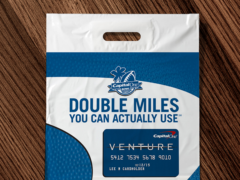 These Capital One Venture Card seatback bags were stuffed with free swag and placed on every seat in the stadium at the 2013 Capital One Bowl college football game in Orlando, Florida.