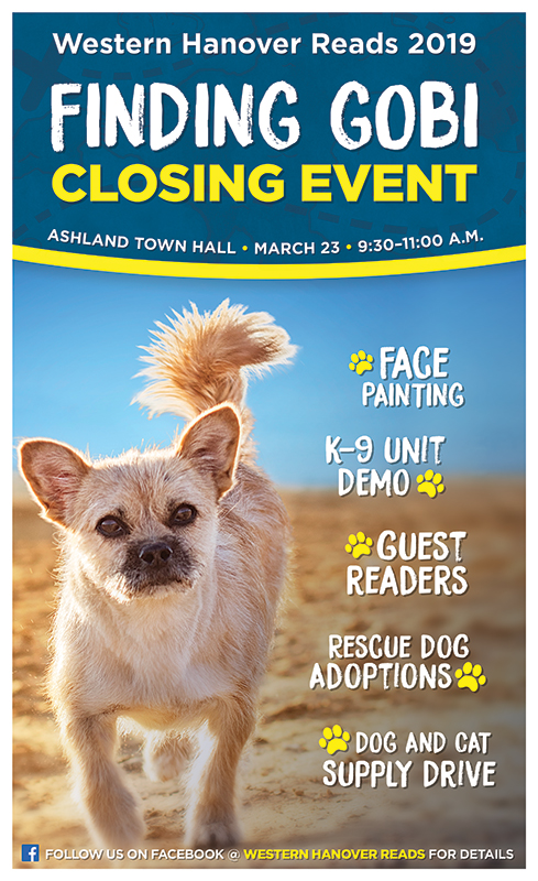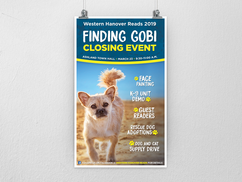 Western Hanover Reads is an organization whose goal is to promote literacy by fostering a sense of community while bringing readers of all ages together through literature. They flew in author Dion Leonard to Ashland, Virginia for an exclusive Finding Gobi book reading, then followed it with a closing event featuring rescue dog adoptions and a pet supply drive. I created these posters to promote the events along with a FatHead vinyl wall decal, bookmark, and t-shirt design.