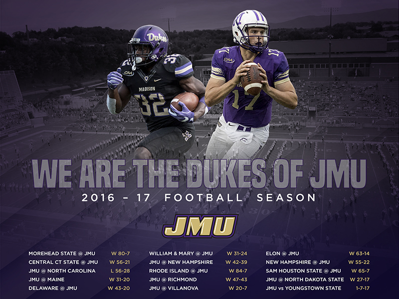 I designed this 11″ x 8.5″ poster to celebrate James Madison University’s dominant ’16–’17 football season. Once framed, it was given as a gift to my dad—a proud JMU alumni and the biggest Dukes football fan I know.