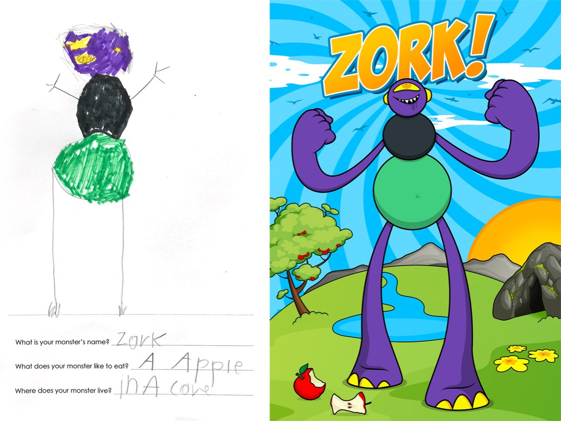 I was able to take part in a really cool event called The Monster Project, where a class of 1st grade kids drew monsters, then artists from all over Capital One recreated them in their own styles. The goal is to help children recognize the power of their own imaginations and to encourage them to pursue their creative potential. I put my own spin on an apple eating, cave dwelling monster named Zork.