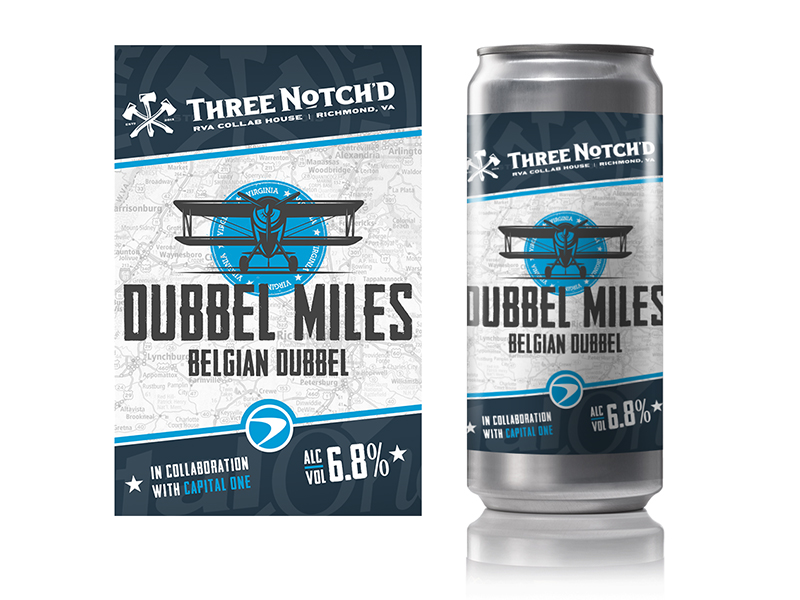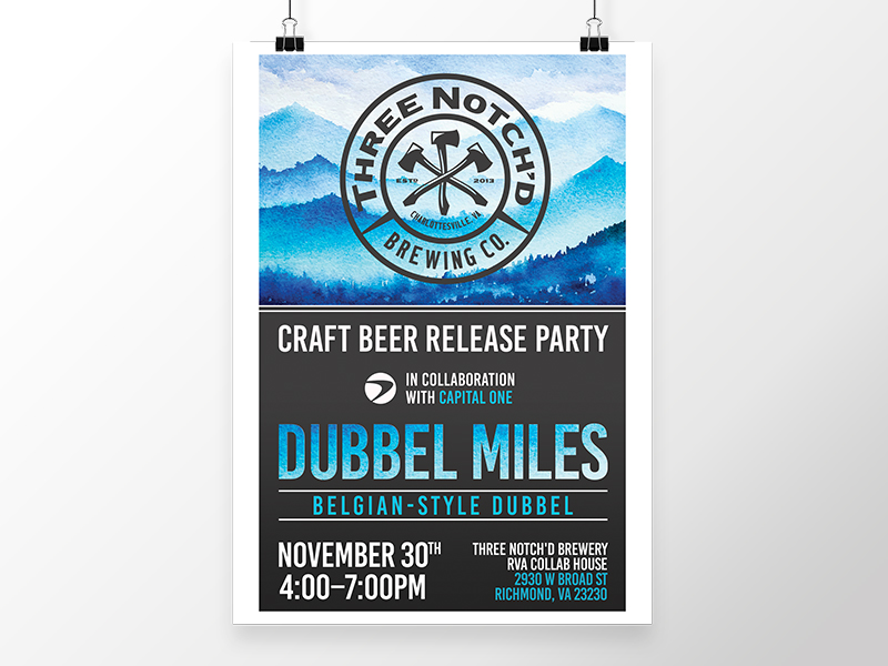 A collaborative project between the Capital One Design Makers group and the Three Notch’d Brewey Collab House in Richmond, VA, we were tasked with creating and branding a beer from scratch. After landing on the name “Dubbel Miles,” I designed this crowler (32 oz. can) label and release event poster.