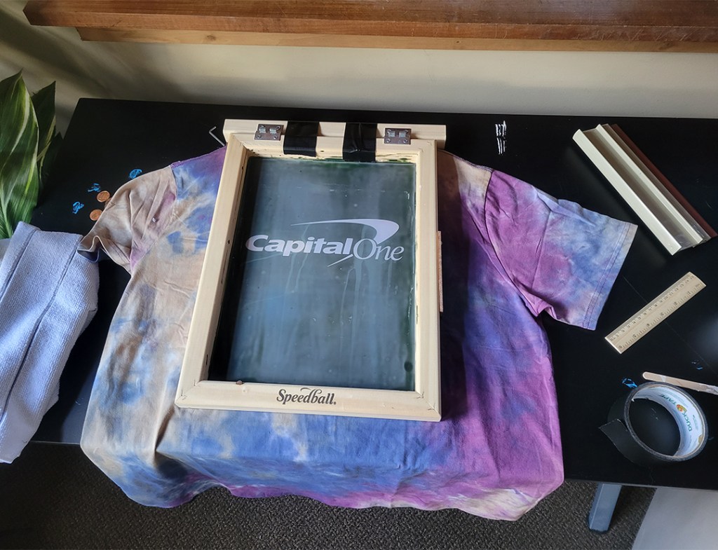 I had wanted to learn to screen print for a long time so I bought a kit on Amazon and went for it. After a little reading and a lot of trial and error, I completed my first successful print on a tie-dye shirt – a Christmas gift for a friend at work.